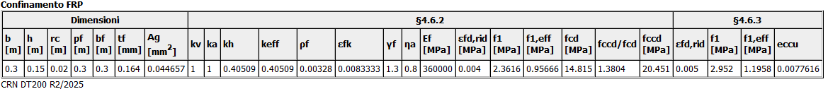 Gli effetti del confinamento dovuto al rinforzo con FRP sono calcolati come indicato nei §4.6 DT200R2. Nella seguente tabella sono riportati i dettagli del calcolo del confinamento. Tutti i simboli riportati fanno riferimento al suddetto paragrafo del DT200R2.