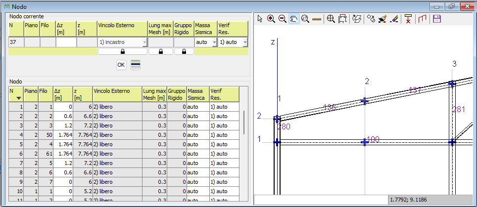 Manuale JaspMenù StrutturaInput per Piani Verticali Nodi PV Permette la modifica degli attributi dei nodi direttamente in un piano verticale. Dopo aver scelto o confermato il Piano Verticale compare la seguente maschera: Per la descrizione di ogni singolo attributo vedere menĂ¹ Struttura/Nodi.
