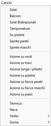 Con il menù carichi è possibile inseriti i vari tipi di carichi sulla struttura. Il menù contiene i seguenti comandi: