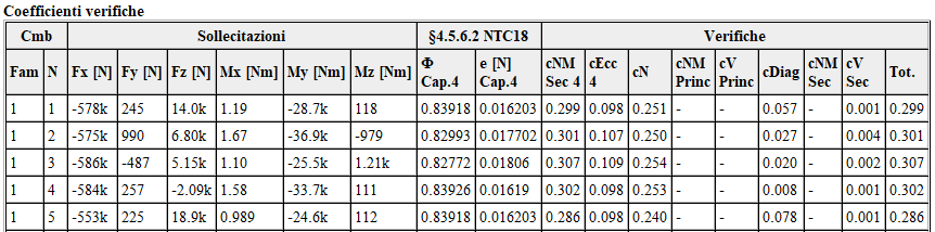 •Verifiche. Coefficienti di verifica per la combinazione corrente. Già descritti in precedenza per la tabella "Coefficienti Verifiche SLU Sezioni"