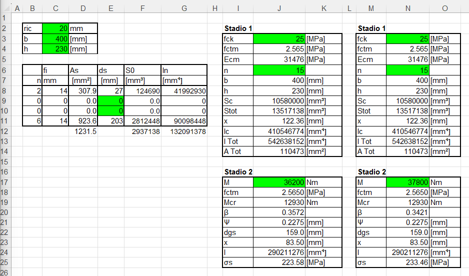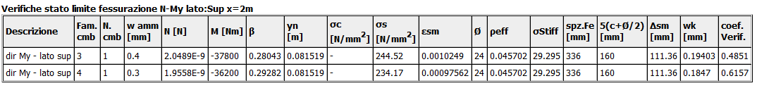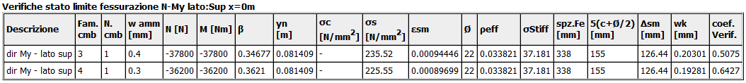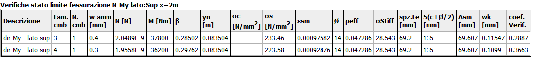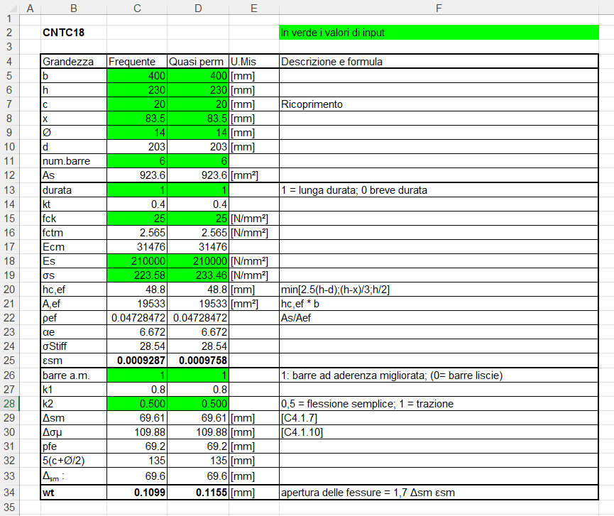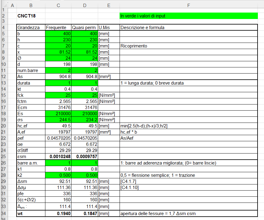 L'ampiezza delle fessure è calcolata utilizzando un foglio di calcolo ed i risultati sono conformi a quelli forniti da Jasp